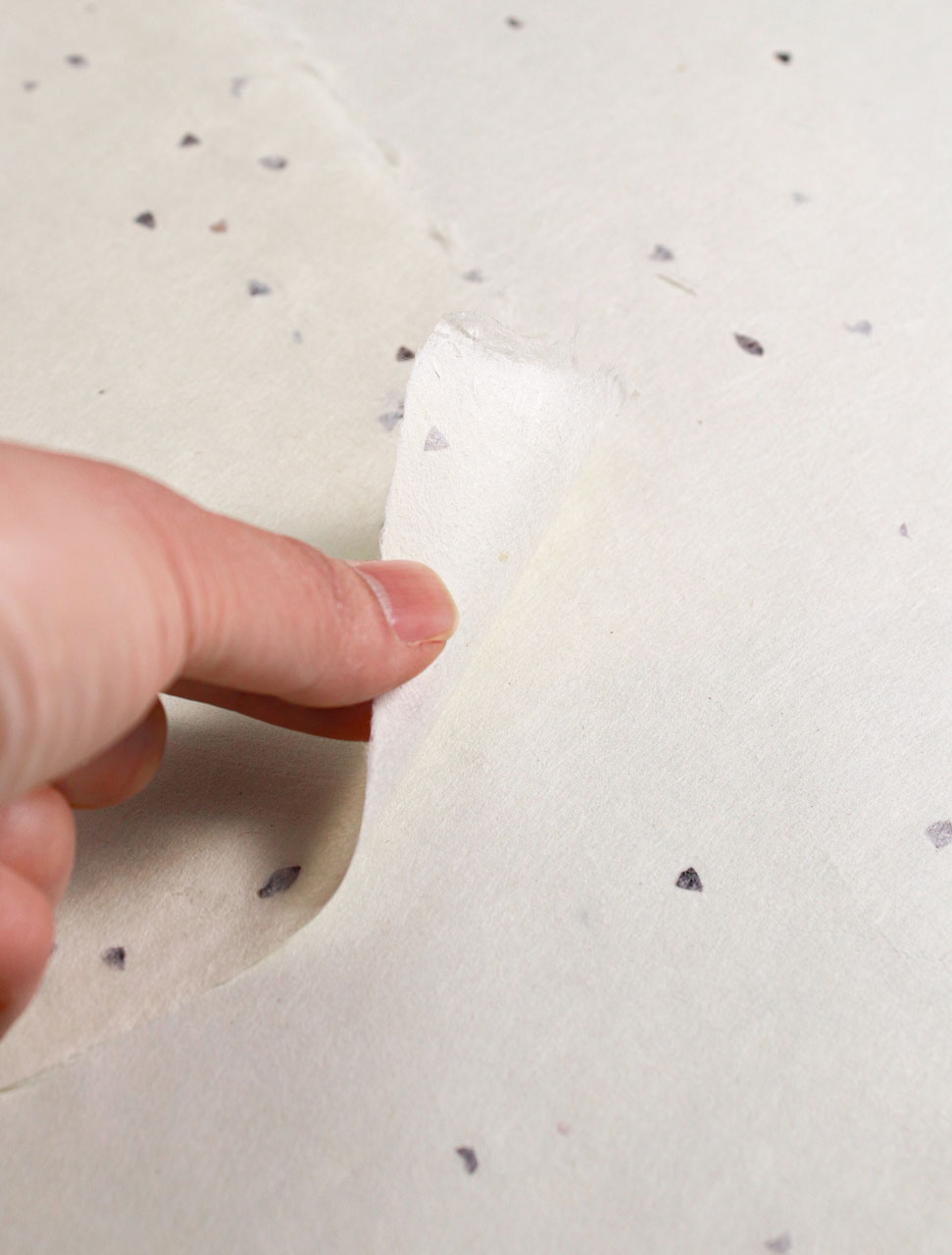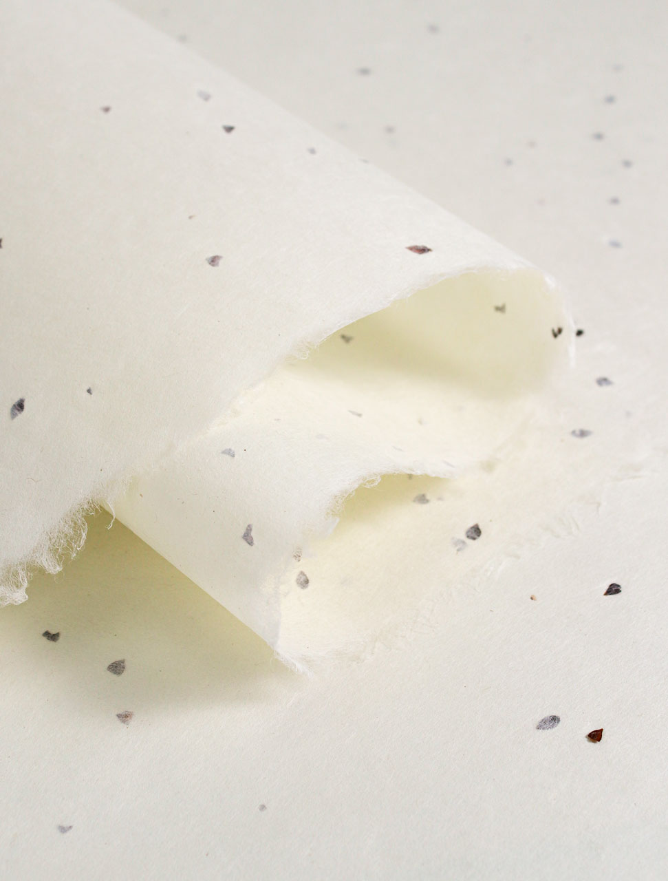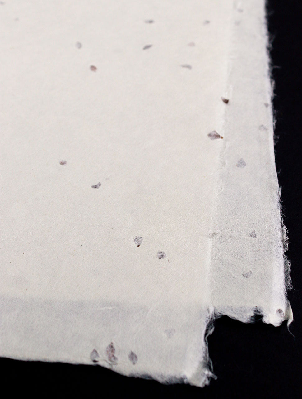 Handmade by a skilled papermaker using 100% Japanese mitsumata. The seed flecks have been intentionally included in the sheets for a decorative effect. Mitsumata fibre is softer and more pliable than kozo, with a smooth, refined surface. It takes nearly twice as long to grow, compared to kozo, and is therefore considered to be a more luxurious fibre. Excellent for brush and pen drawing, relief printing, and lampmaking. Heritage Washi (HW).
