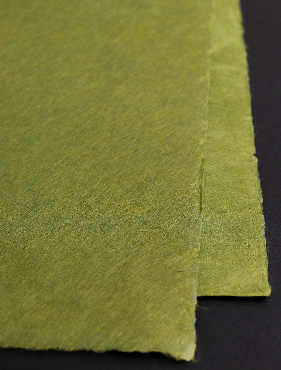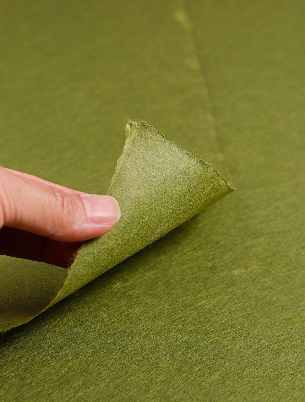 "Uguisu" means Japanese bush warbler, as well as one of the traditional colour names. This handmade, dyed kozo paper is excellent for covering books, box making, painting, drawing, and printmaking.